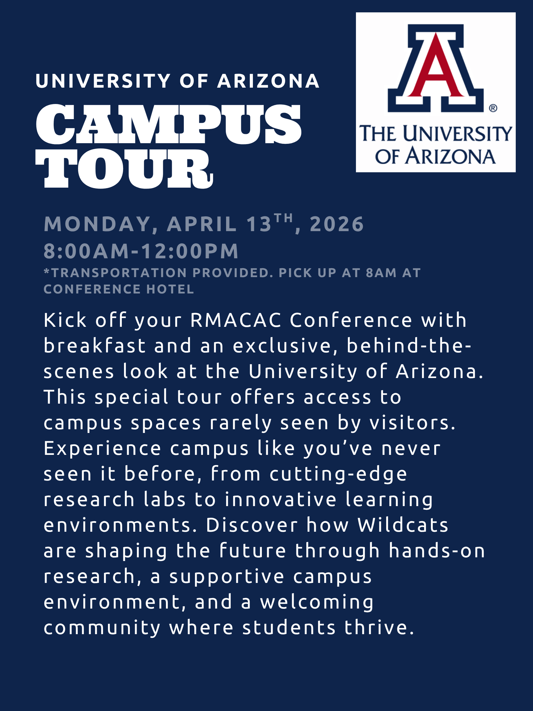 University of Arizona- Monday, April 13, 2026 from 8:00am-12:00pm If you are a local institution in Tucson and wish to open your campus to college tours before or after Annual Conference 2026, please reach out to Sara Strickland. First Timers SessionThe RMACAC board will host a lunch for first timers just before the conference officially begins. During the luncheon, you'll discover more about RMACAC's activities and how you can participate. We will also share valuable advice and best practices to enhance your conference experience. Additionally, you'll have the chance to network with current RMACAC board members, mentors, and other first-time attendees. RSVP required. Invite will be sent prior to the event to conference attendees who have registered as first timers. Counselor College FairUniversity representatives and high school counselors and IECs will be able to network at our Counselor College Fair. High school counselors and IECs attending conference do not need to register in order to attend. College professionals will need to register for the college fair when registering for the conference. University representatives are encouraged to bring materials to share. We will use StriveScan scanning technology so high school counselors and IECs will be able to be scanned. Post-secondary participants will receive instructions on how to scan prior to the event from StriveScan. Registration is full for this event. Each university will be allowed one table and up to two representatives for the counselor college fair. Cost to register is $75 per table (2 reps max per table). Volunteer at ConferenceInterested in helping RMACAC at Annual Conference? Information will be shared with registered attendees in March 2026. Volunteer